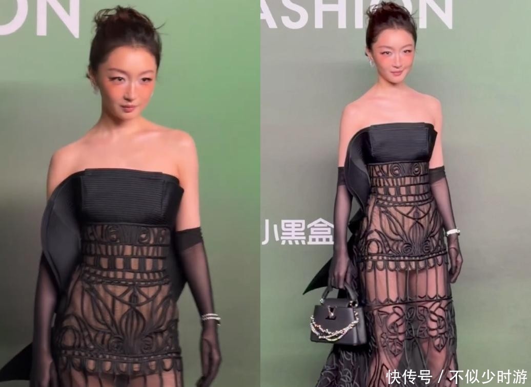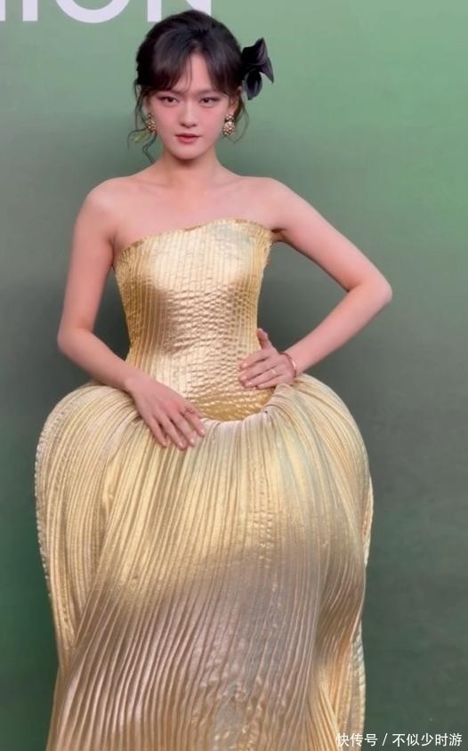 整件礼服采用紧缚式剪裁,从上身一路缠绕至膝盖,导致腿部活动严重受限,每走一步都像在挣扎。镜头拉近时,大腿部位因布料挤压而产生的褶皱清晰可见,场面一度十分尴尬。