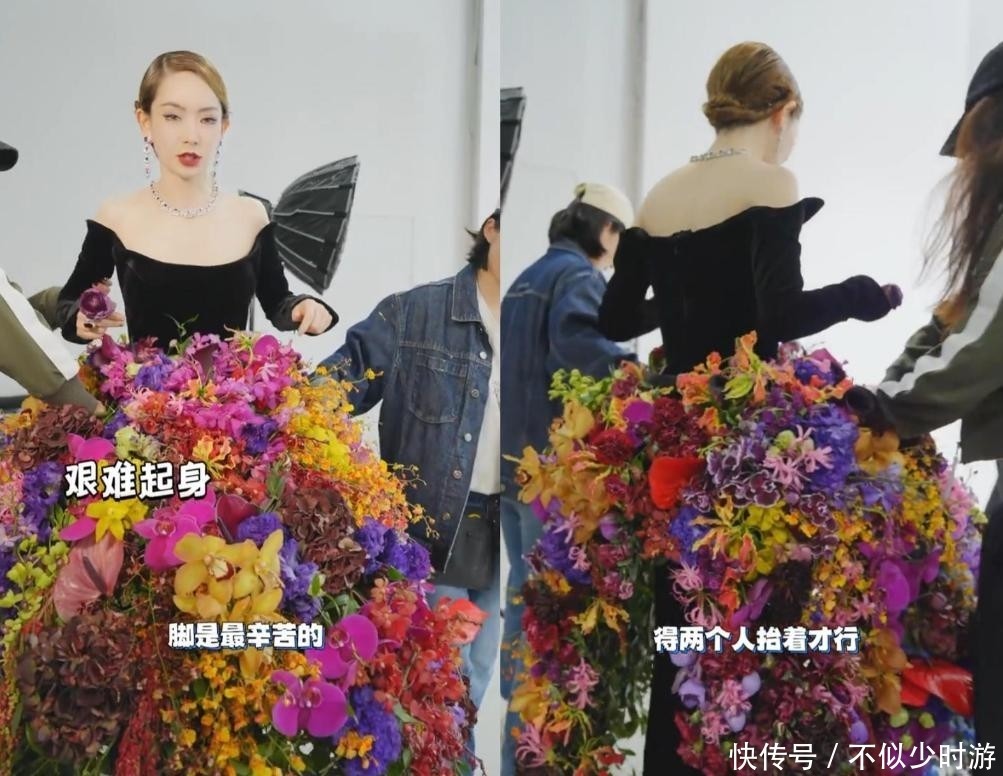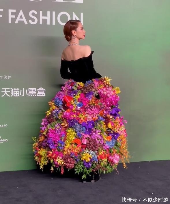 她身上那件礼服上的花朵,并非人工织物,而是由真实鲜花手工编织而成。为了确保花瓣色泽鲜亮,整件服饰的制作过程全部安排在活动当天完成。