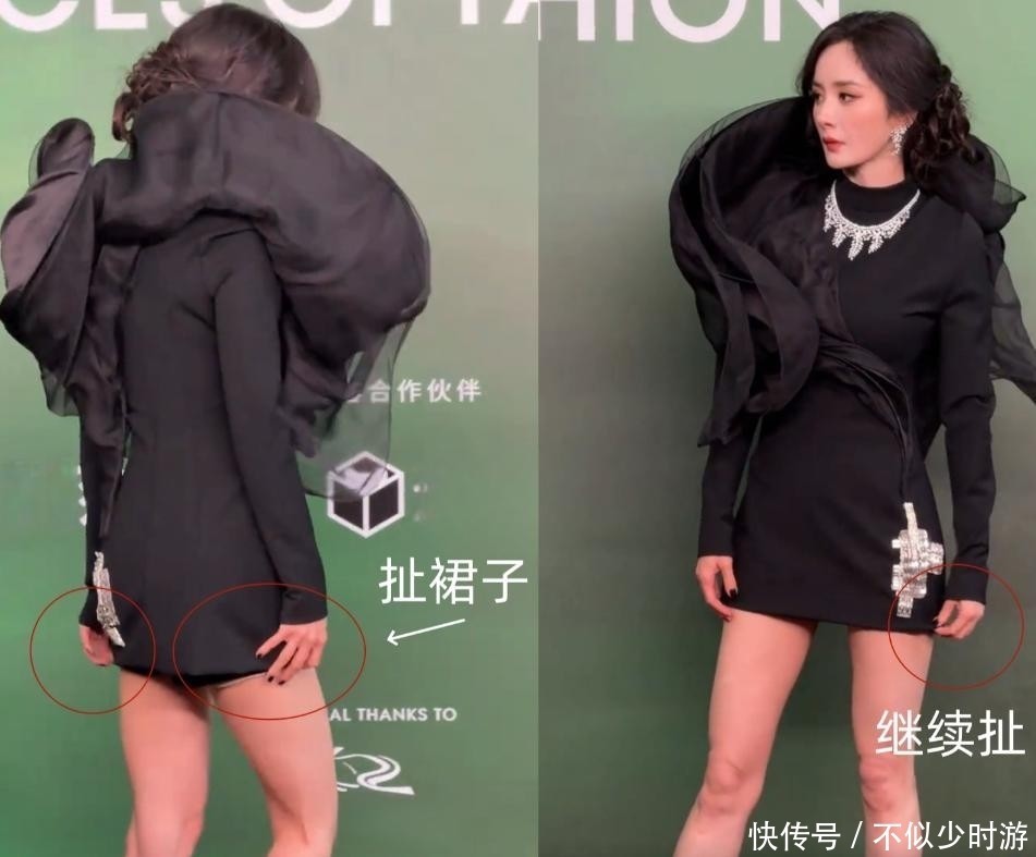 更致命的是裙长过短,安全裤边缘若隐若现。整个红毯过程中,杨幂不得不频繁低头整理裙摆,小动作不断,显然自己也意识到问题所在。