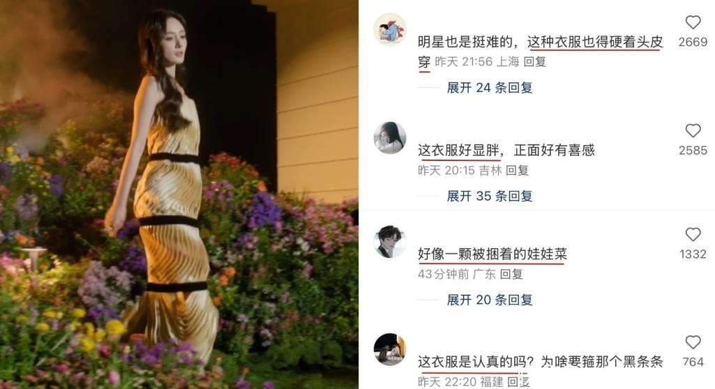 作为压轴登场的重量级人物,杨幂甫一亮相便吸引了全场目光,可惜这份关注很快变成了热议与调侃。她所穿的亮黄色丝绒长裙,本应凸显肤色优势,却因设计过于奇特而适得其反。
